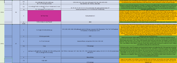 Between April and July of 2024, I trained to PR my 1-mile. In that vein, I wanted to review my training with my training logs and analyze how I thought the train-up actually went. This should be read alongside my journal, which I’ve posted here. (A note: I did very little cleanup on this file, so weekly milage will be inaccurate until week 12).
